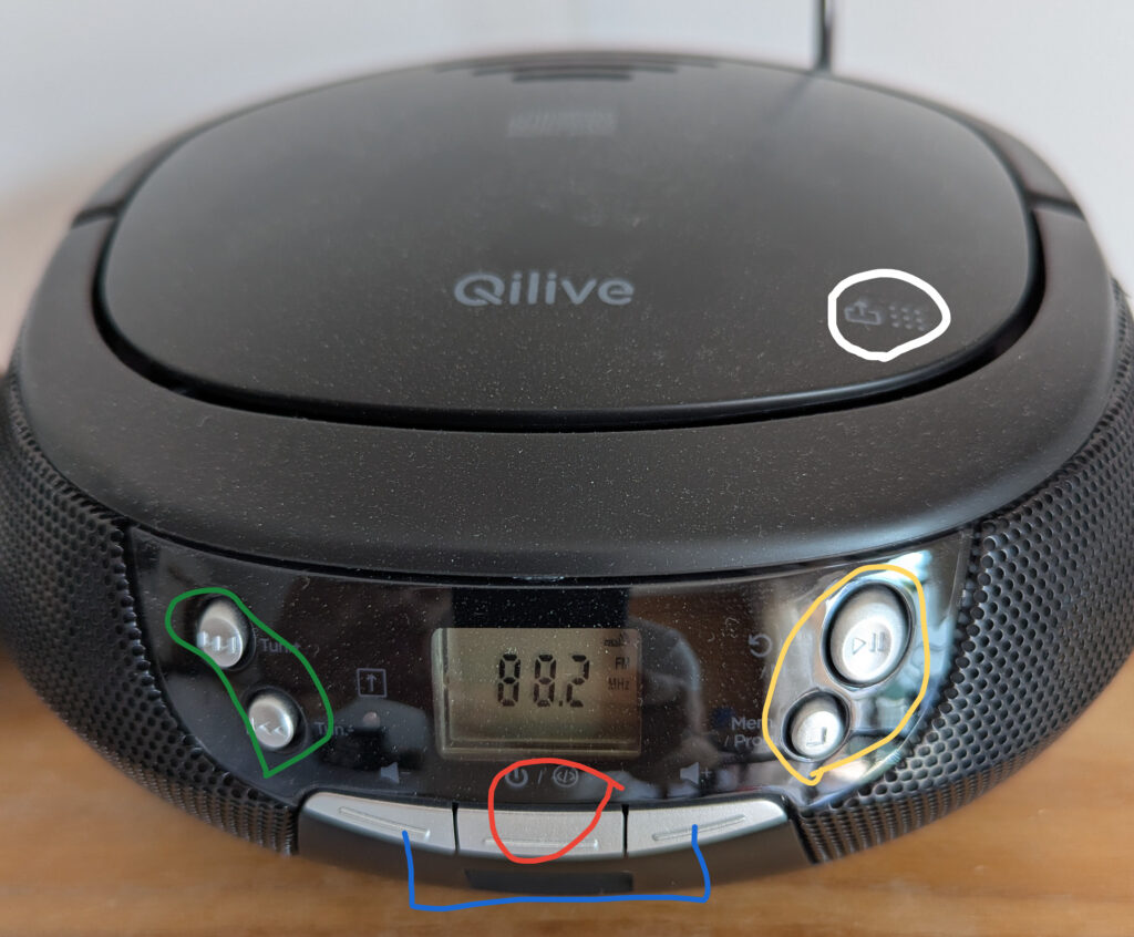 Radio : CD Allumer / naviguer / éteindre Appuyer une fois pour allumerAppuyez plusieurs fois pour accéder aux fonctions AUX – CD – RADIOAppuyez longuement pour éteindre Fonction radio / CD Utilisez les flèches pour choisir les stationsAppuyez sur le repère blanc pour ouvrir le lecteur CDLire le CD, mettre en pause ou l’arrêter Piste suivante / précédenteRéglez le volume